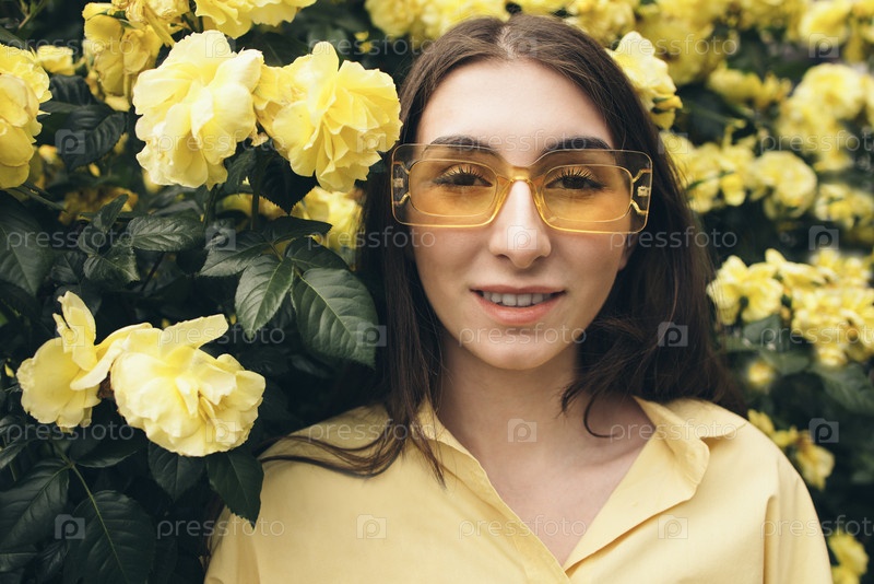 Молодая женщина с длинными темными волосами, одетая в желтые солнцезащитные очки и желтую рубашку, улыбающаяся в ярком саду, наполненном цветущими желтыми розами, демонстрирующей веселую весеннюю атмосферу