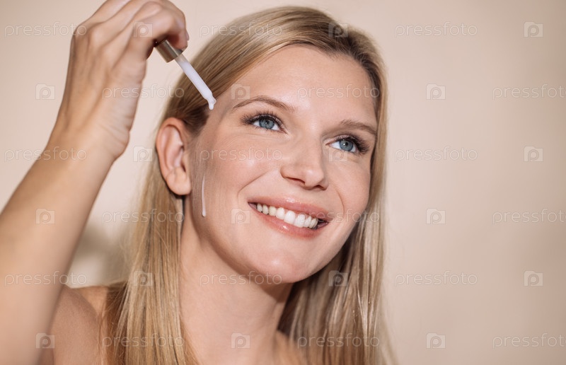 Улыбающаяся женщина с длинными светлыми волосами наносит сыворотку на лицо с помощью капельницы, демонстрируя рутину ухода за кожей и практики самообслуживания в яркой, приглашающей среде