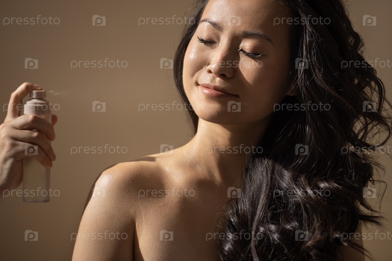 Азиатская женщина с длинными темными волосами наслаждается освежающим спреем продукта красоты на плече, подчеркивая рутину ухода за кожей и моменты самообслуживания в спокойной обстановке