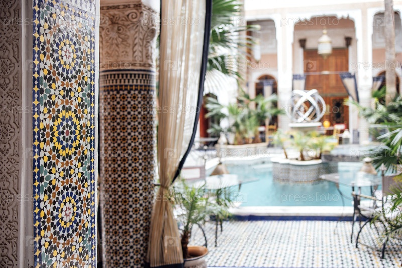 Украшенный марокканский двор с сложной плиточной работой, пышной зеленью и тихим бассейном с декоративными скульптурами в центре, создавая спокойную атмосферу