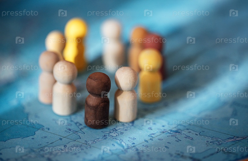 Группа деревянных фигур в различных цветах, стоящих на синей карте, представляющих разнообразие и сообщество с акцентом на центральную темно-коричневую фигуру