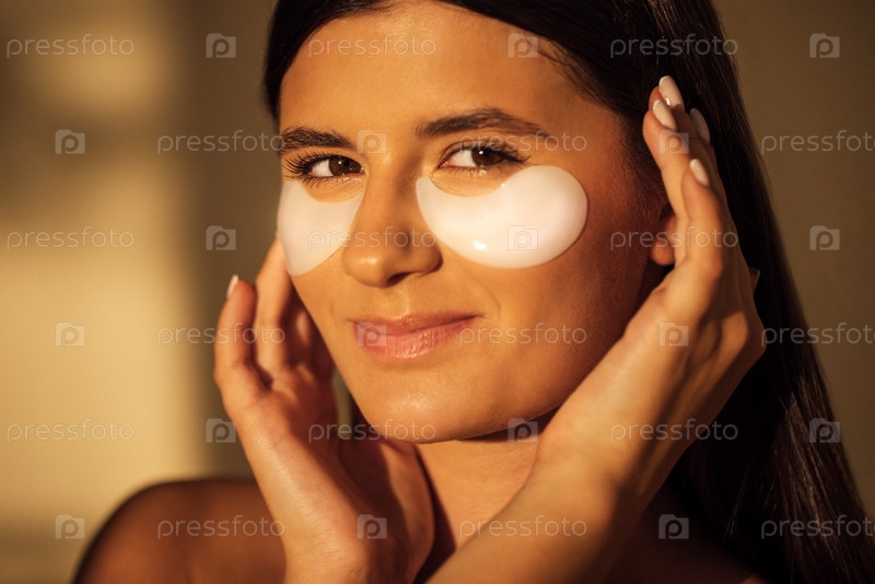 Молодая женщина наносит пластыри под глазами, демонстрируя рутину ухода за кожей, освещенную мягким естественным светом, подчеркивая красоту и практики самообслуживания для омоложения и расслабления