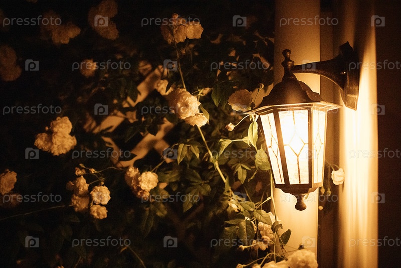 Винтажный наружный фонарь, освещаемый ночью в окружении летящих белых роз и зеленых листьев на стене, создает теплую и гостеприимную атмосферу