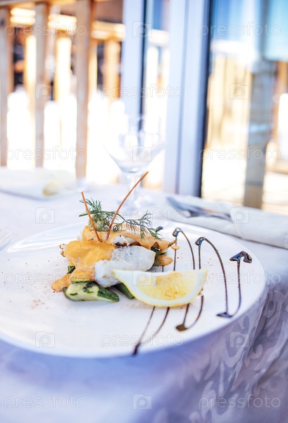 Гурманское блюдо из морепродуктов, элегантно покрытое лимонными ломтиками и гарнирами на белой тарелке, установлено на столе с размытым фоном ресторана