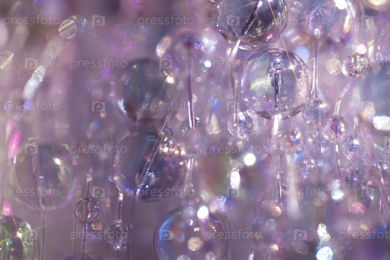 Близкий снимок полупрозрачных стеклянных бусин различного размера, отражающих свет, создавая блестящий эффект на мягком фиолетовом фоне