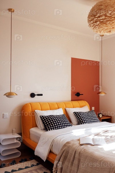 Современная спальня со стильной оранжевой кроватью с узорами подушек, теплым освещением и минималистическим декором создает уютную атмосферу для отдыха