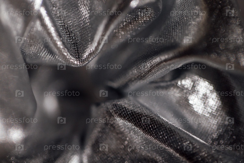 Близкий взгляд на складчатую металлическую серебряную ткань, демонстрирующую сложную текстуру и блеск, идеально подходит для модных, дизайнерских или текстильных приложений