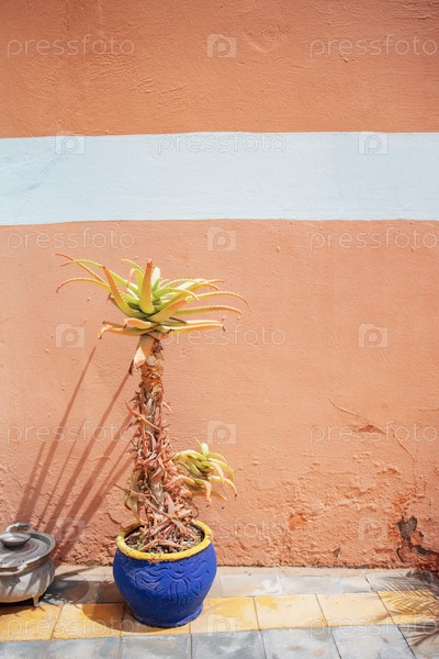 Постное растение алоэ вера с длинными зелеными листьями в голубом керамическом горшке против текстурированной оранжевой стены со светло-синей полосой