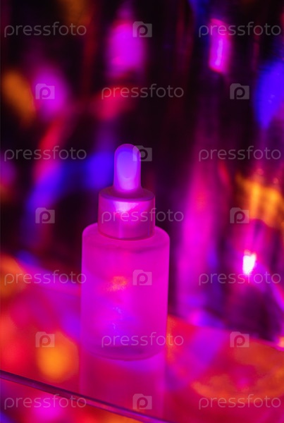 Прозрачная стеклянная бутылка для капель с белой крышкой, освещенной красочными огнями на размытом ярком фоне розовых, фиолетовых и синих оттенков