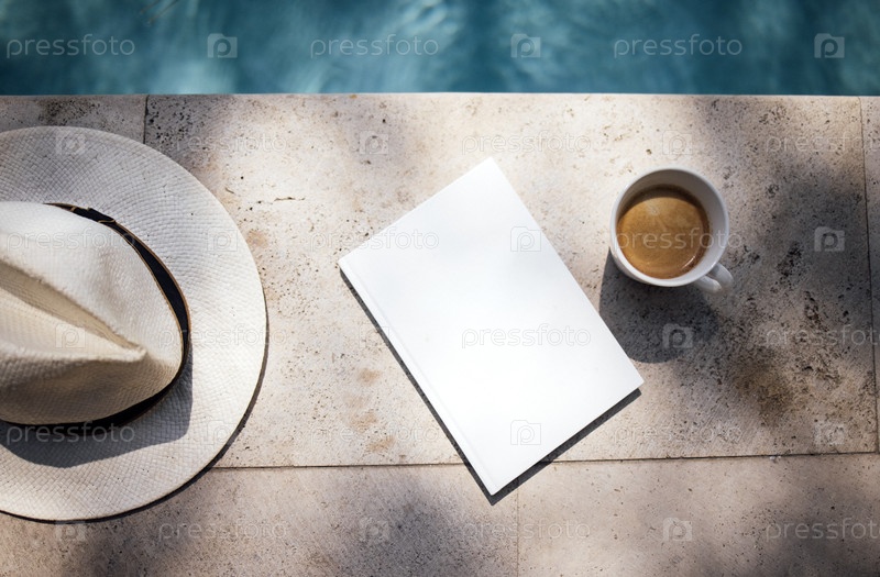 Белая соломенная шляпа, пустой блокнот и чашка для кофе расположены на каменной поверхности рядом с бассейном со светящейся водой в фоне