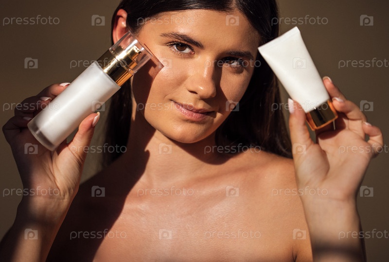 Молодая женщина с длинными волосами держит средства по уходу за кожей в обеих руках, демонстрируя предметы красоты на теплом мягком фоне, подчеркивая самообслуживание и благополучие