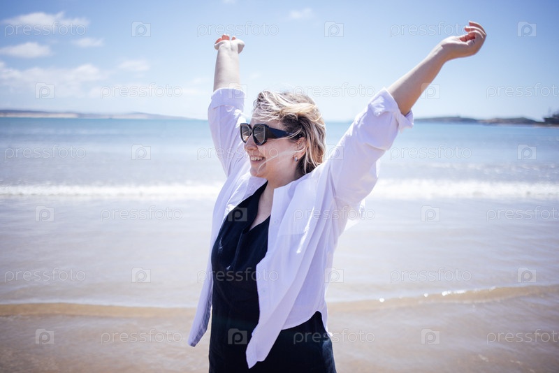 Веселая женщина с солнцезащитными очками и легкой рубашкой стоит на песчаном пляже, руки подняты в знак празднования, наслаждаясь солнечным днем у океана, воплощая счастье и свободу