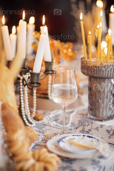 Элегантный столовой набор для праздничного случая с зажженными свечами, стаканом воды, декоративным хлебом и сложной посудой, устроенной для специального собрания