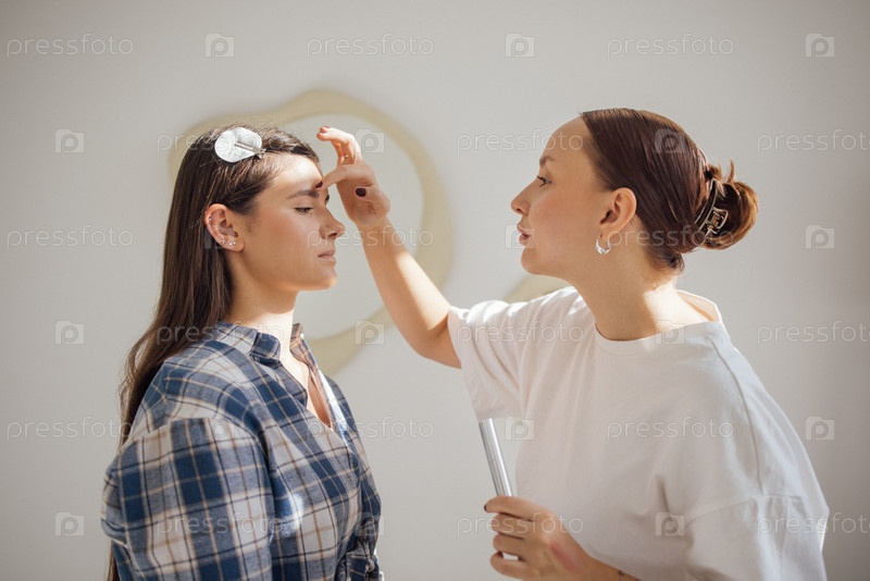 Женщина-макияжер наносит косметику женщине с длинными волосами в яркой студии, демонстрируя техники красоты и профессиональное мастерство в спокойной обстановке