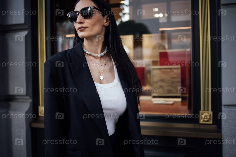 Стильная женщина в солнцезащитных очках и черном блейзере уверенно стоит за пределами бутика, демонстрируя современную моду и городской образ жизни в оживленной среде города