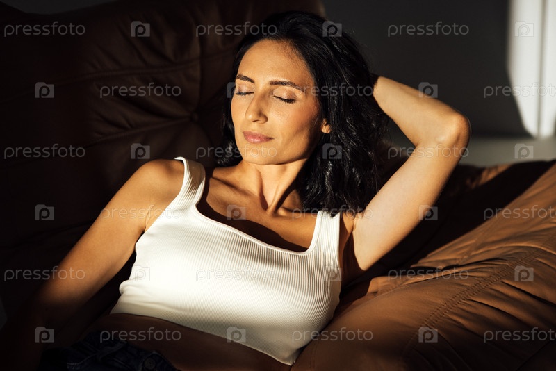 Женщина с темными волосами отдыхает на коричневом кожаном диване, наслаждаясь солнечным светом, проходящим через окно, создавая теплую и спокойную атмосферу для самообслуживания и покоя