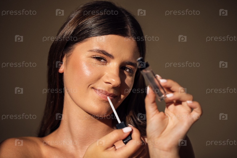 Молодая женщина с длинными темными волосами наносит сыворотку из стеклянной бутылки-капельницы, демонстрируя рутину ухода за кожей с теплым мягким фоном, подчеркивающим красоту и самообслуживание