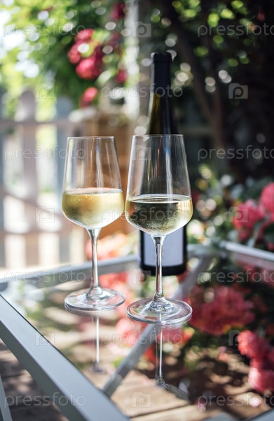 Два элегантных бокала, заполненные белым вином, расположены на стеклянном столе с бутылкой вина и цветущими цветами в фоне