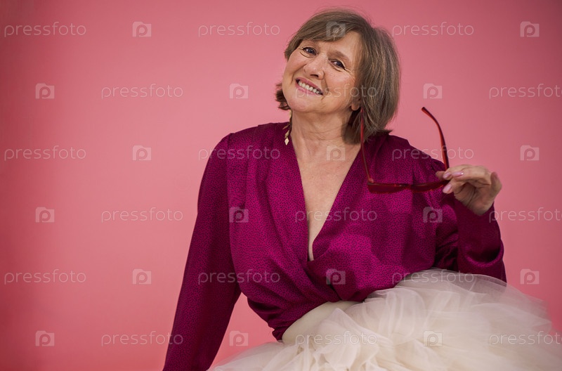 Зрелая женщина с короткими седыми волосами, одетая в блузку фуксии и белую тюльскую юбку, игриво позирует на розовом фоне, держа солнцезащитные очки в правой руке