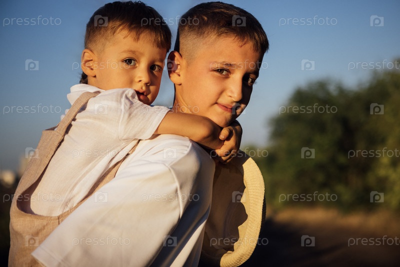 Два мальчика, один неся другого на спине, радостно улыбаясь в солнечной атмосфере, окруженные зеленью, демонстрируя связь дружбы и детскую невиновность