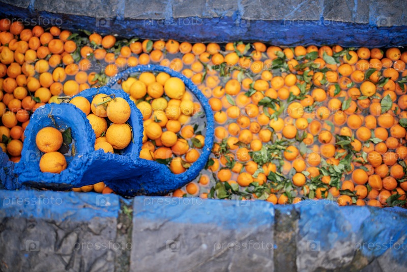 Свежие апельсины в голубой корзине, окруженные рассеянными апельсинами в каменном бассейне с зелеными листьями, видимыми в воде