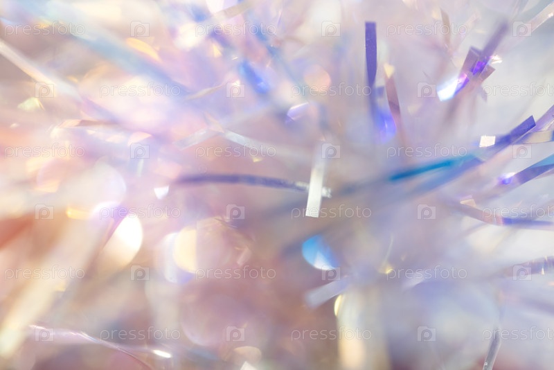 Красочные нитки блестящего тинзеля в различных оттенках создают праздничный фон с мягкими эффектами боке, идеально подходят для тематики праздника и торжества