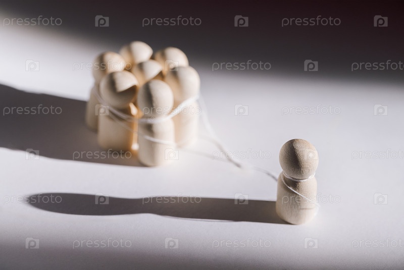 Деревянные статуэтки, представляющие социальную динамику, одна изолированная фигура выделяется среди группы связанных друг с другом фигур, привязанных веревкой на белом фоне