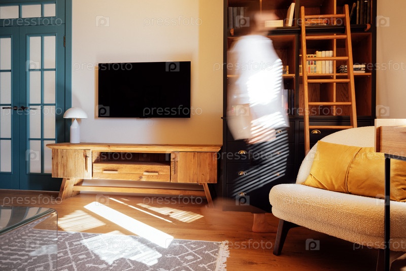 Современный интерьер гостиной со стильным диваном, деревянными мебелью и телевизором с человеком в движении создает динамичную атмосферу