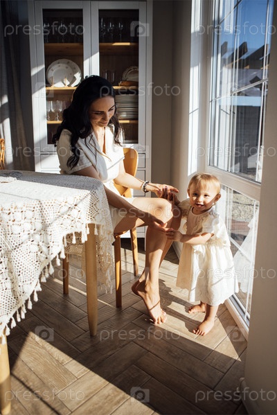 Молодая женщина с длинными темными волосами сидит за столом в солнечной комнате, взаимодействует с малышом в белом платье и демонстрирует теплый семейный момент