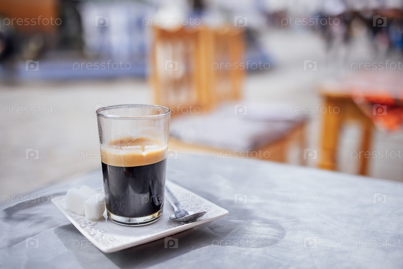 Стакан черного кофе подается на белой тарелке с кубиками сахара и ложкой, деревянные стулья и размытая наружная обстановка видна в фоне
