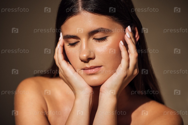 Молодая женщина с длинными темными волосами, нежно обнимающая лицо обеими руками, глаза закрытыми, демонстрируя спокойное выражение и естественную красоту в мягком освещении, передавая спокойствие и самообслуживание
