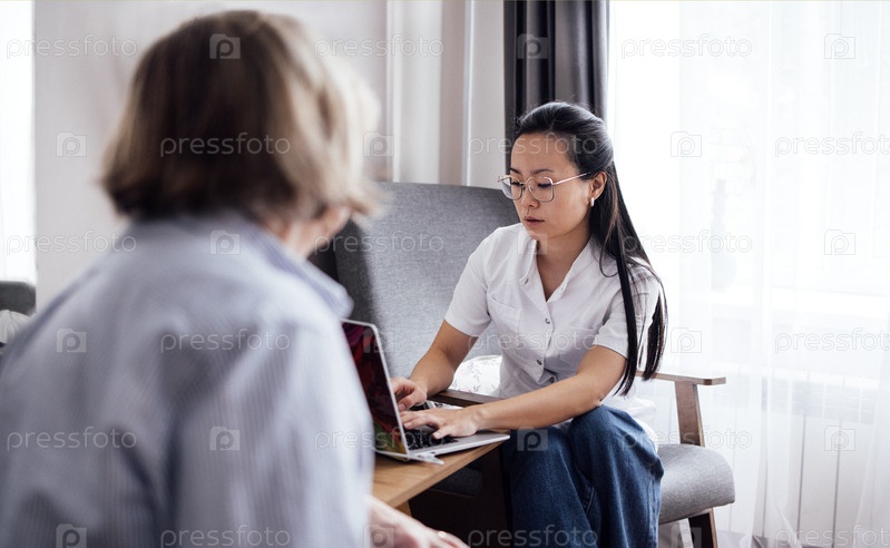 Азиатская женщина в очках помогает пожилой женщине с ноутбуком в яркой гостиной, удобные сиденья и большие окна видны на заднем плане