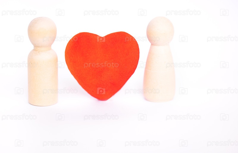 Две деревянные фигурки, расположенные по обе стороны от красной формы сердца на чистом белом фоне, символизируют связь и отношения