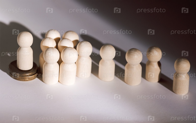 Деревянные статуэтки, представляющие группу людей с одной фигурой, поднятой на монете, бросающей тени на светлую поверхность, символизируя лидерство или влияние