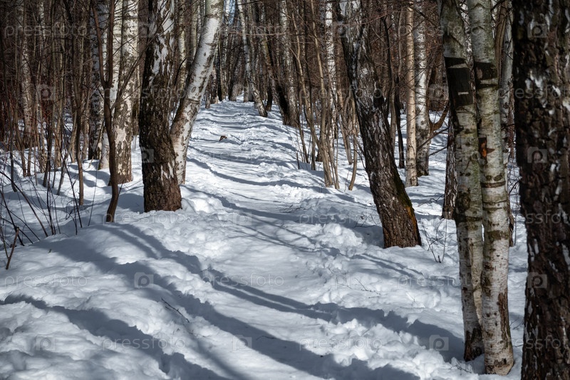 Путь в снежном березовом роще в холодный зимний день