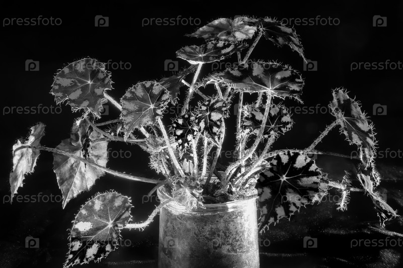 Цветение тигровой бегонии освещается светом на черном фоне. черно-белое фото