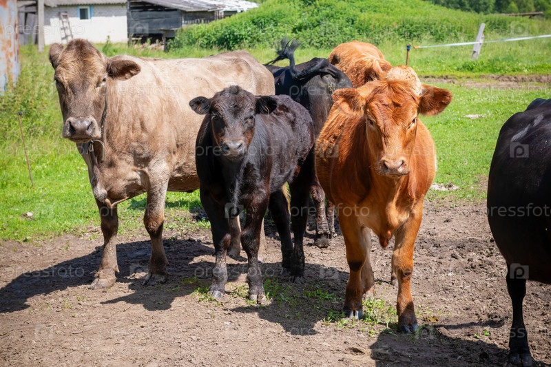 Юные быки и коровы на сельскохозяйственной ферме в солнечный летний день