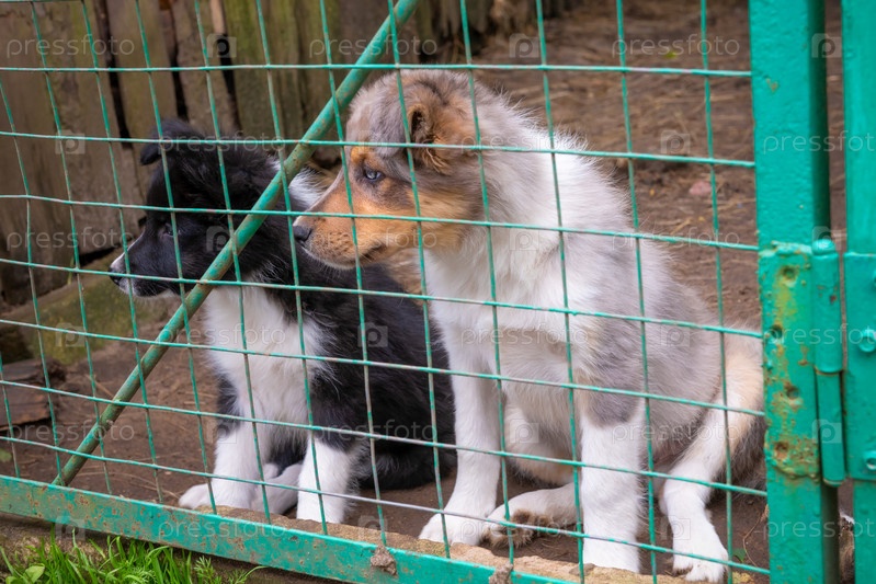 Щенки Border Collie в птичнике на ферме летом