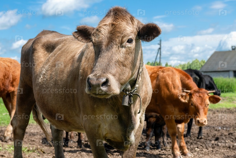 Юные быки и коровы на сельскохозяйственной ферме в солнечный летний день