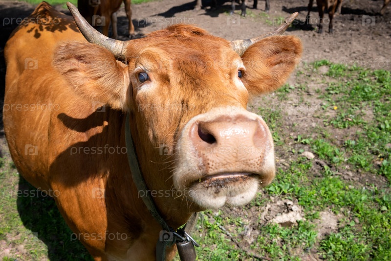 Портрет молодой коровы на сельскохозяйственной ферме в солнечный летний день