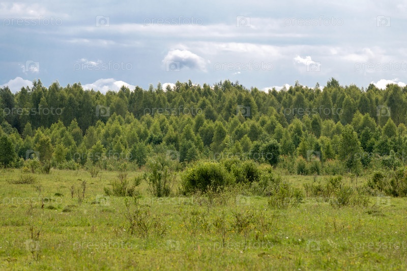 Летний пейзаж с полями и лесом в солнечный летний день