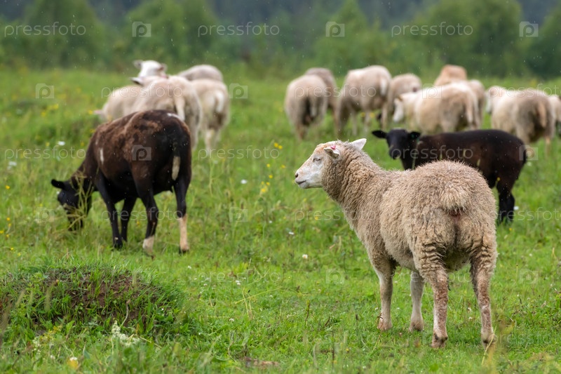 Стадо овец, пасущихся на поле в дождливый летний день