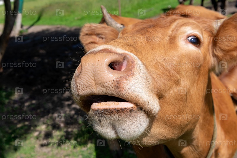 Портрет молодой коровы на сельскохозяйственной ферме в солнечный летний день