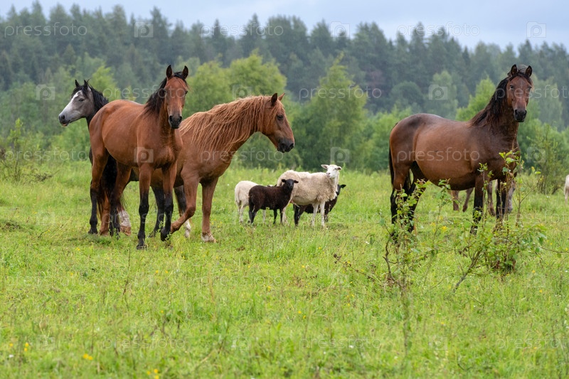 Стадо лошадей, пасущихся на поле в дождливый летний день