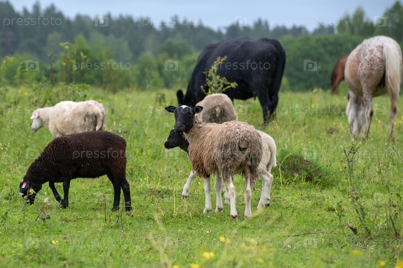 Стадо овец, пасущихся на поле в дождливый летний день