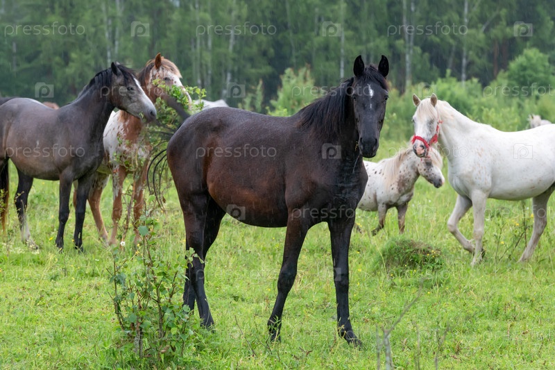 Стадо лошадей, пасущихся на поле в дождливый летний день