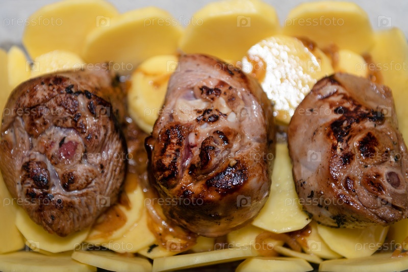 Кусочки жареной индейки помещают на сырые картофели перед выпечкой в духовке