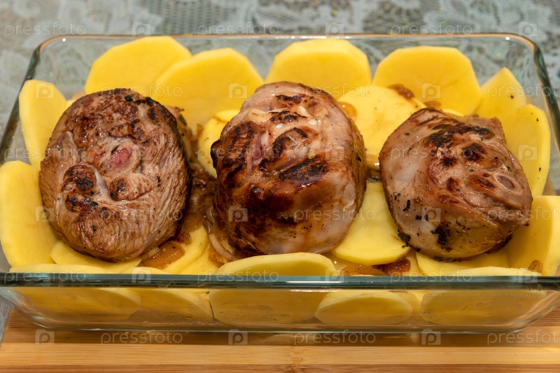Кусочки жареной индейки помещают на сырые картофели перед выпечкой в духовке