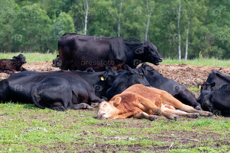 Коровы спят на земле на ферме в солнечный летний день