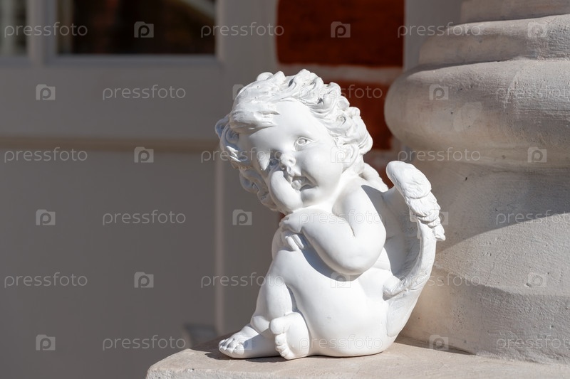 Москва, Россия - 25 сентября 2024 года: Статуя ангела в парке. Маленький мальчик с крыльями. статуя Купидона в осеннем парке. Фигура для дизайна, мраморный печальный ангел сидит опираясь на колонну